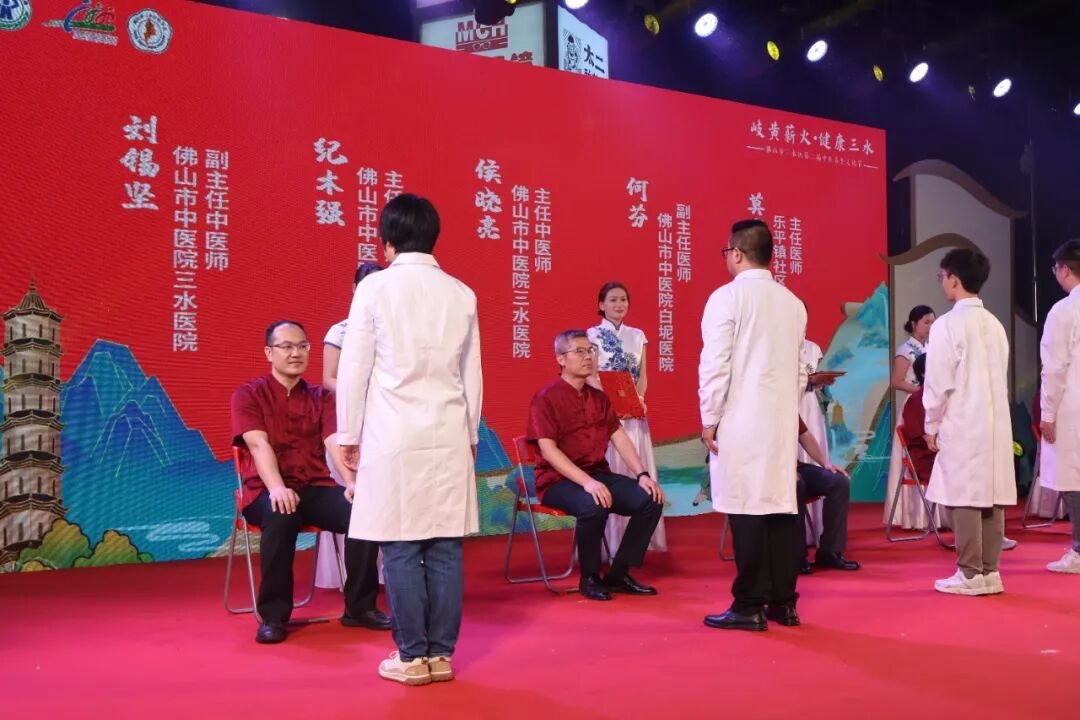 中医师承拜师仪式是当晚的一大亮点。我院心病科侯晓亮、骨伤科纪木强、脑病科刘锡坚三位名中医与其他医疗机构的7位中医专家一同,现场收下12位年轻中医学子为徒。这一仪式不仅是中医药人才培养的重要举措,更是三水区中医药事业薪火相传的生动体现,为区域中医药发展注入了新鲜血液。