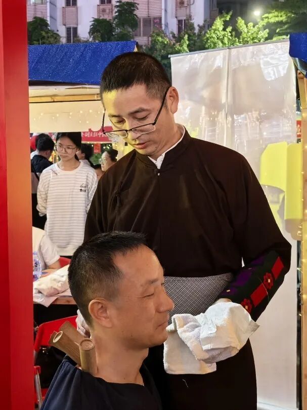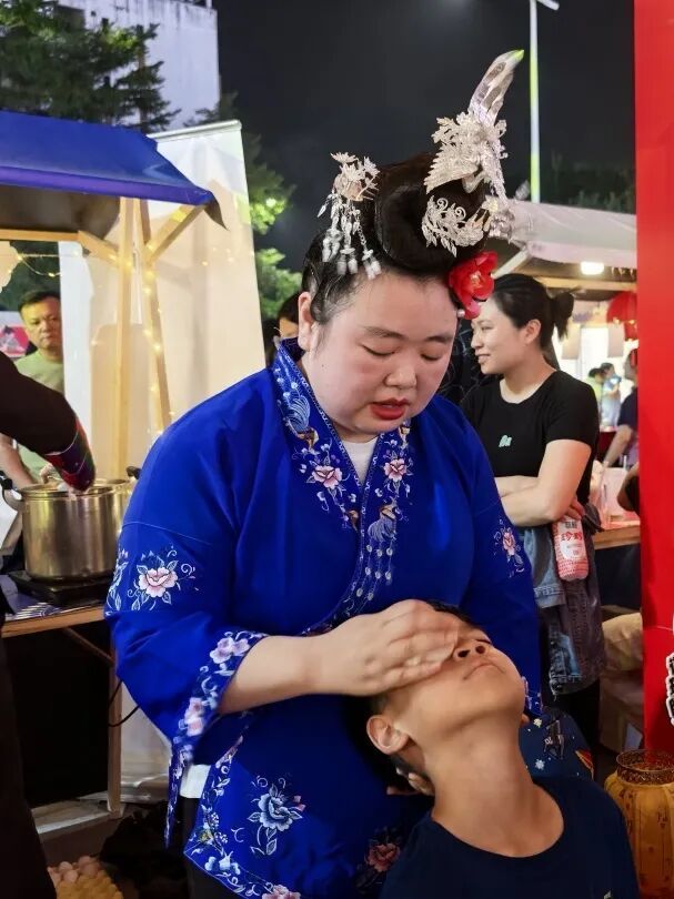 在“民族医体验区”,三水中医院邀请了友好单位台江县民族中医院的苗侗中医师张福友与主管护师杨昵分别带来苗药罐疗法与履蛋疗法,让大家在家门口就能体验来自黔东南的传统民族疗法。